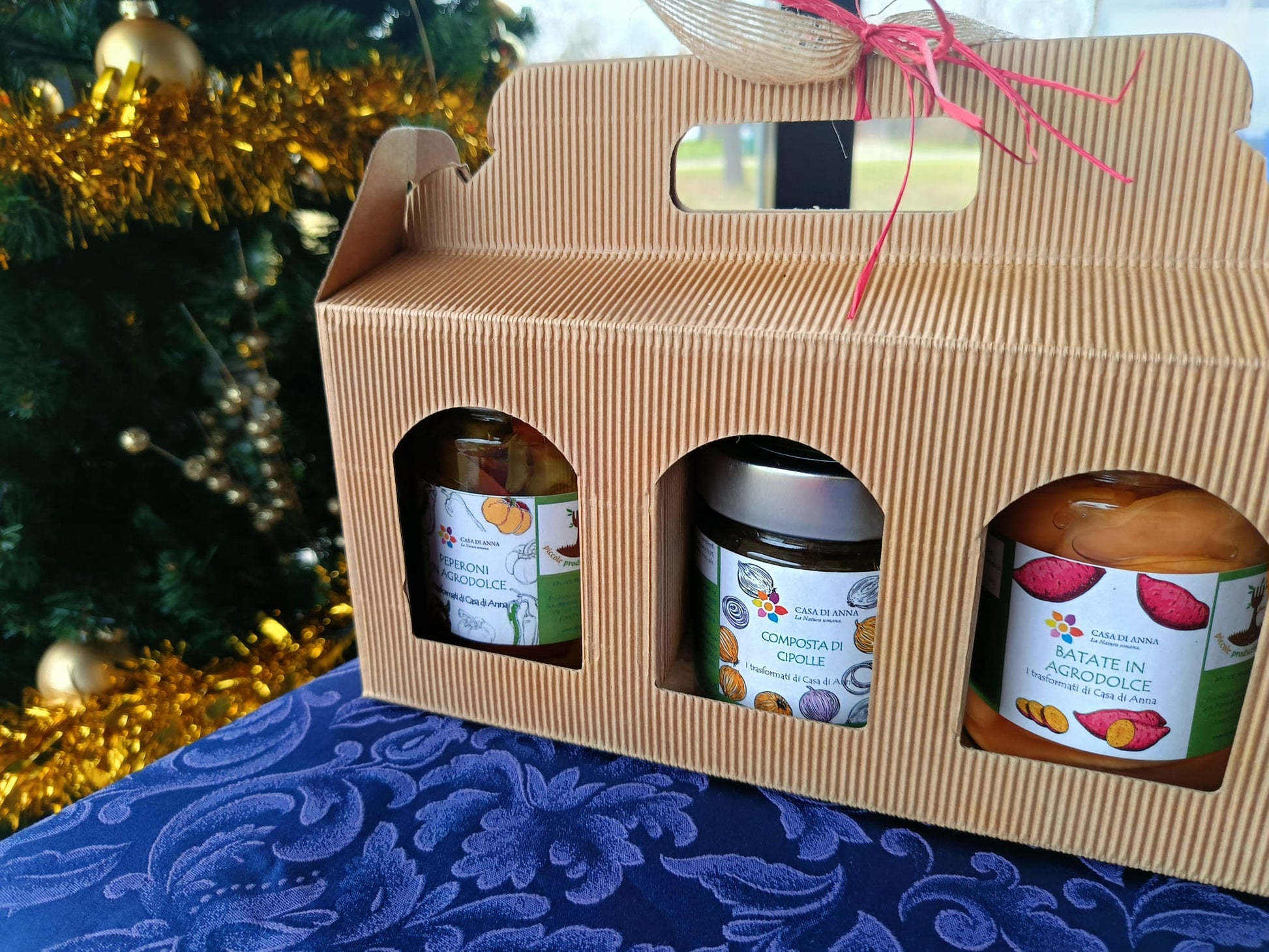 Due vasetti di agrodolce in due gusti differenti, Giardiniera, Biglietto di auguri di Anna. Confezione in scatola